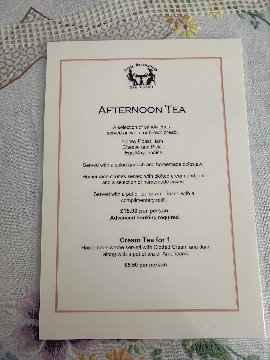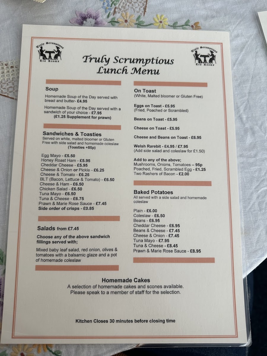 The menu at Truly Scrumptious offers a delightful selection of comfort food, perfect for a casual meal. For sandwich lovers, they provide classic choices such as Egg Mayo, Honey Roast Ham, Cheddar Cheese, Cheese & Onion or Pickle, and Cheese & Tomato. If you prefer something hot, their selection of Toasties is equally tempting. On the "On Toast" menu, you'll find comforting options like Eggs on Toast, Beans on Toast, Cheese on Toast, and Cheese and Beans on Toast, with the indulgent Welsh Rarebit offering a rich, cheesy alternative. For those craving a heartier meal, the baked potato options are a standout, including the Plain, Coleslaw, Beans, and Cheddar Cheese varieties, or the more filling Beans & Cheese. As for something extra, their Homemade Soup of the Day is available served with either bread and butter or paired with a sandwich of your choice, making it a perfect comfort option. Overall, Truly Scrumptious offers a simple yet satisfying menu that caters to all tastes, with each dish promising hearty, home-cooked flavors.